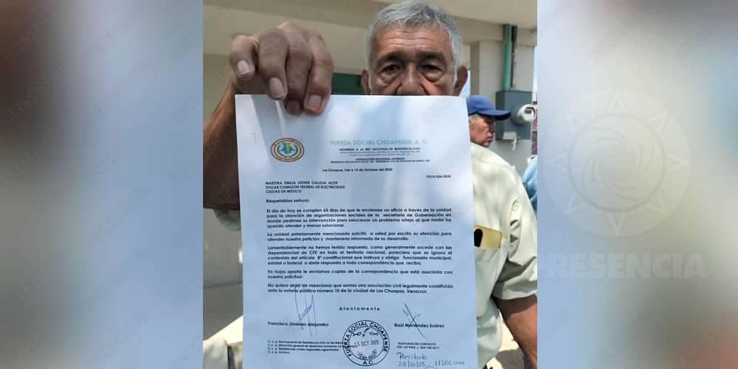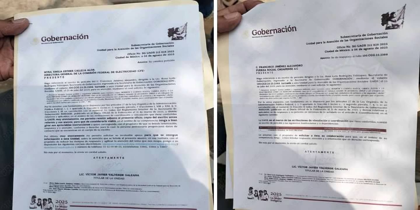 Jiménez Alejandro denunció que la Unidad para la Atención de Organizaciones Sociales de la Subsecretaría de Gobernación, con fecha 6 de agosto, giró instrucciones a la directora general de la CFE, Emilia Esther Callejas Alor, para atender el caso de Las Choapas, pero han pasado más de dos meses y medio sin respuesta.