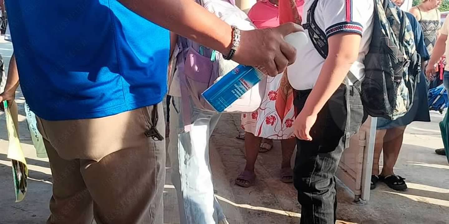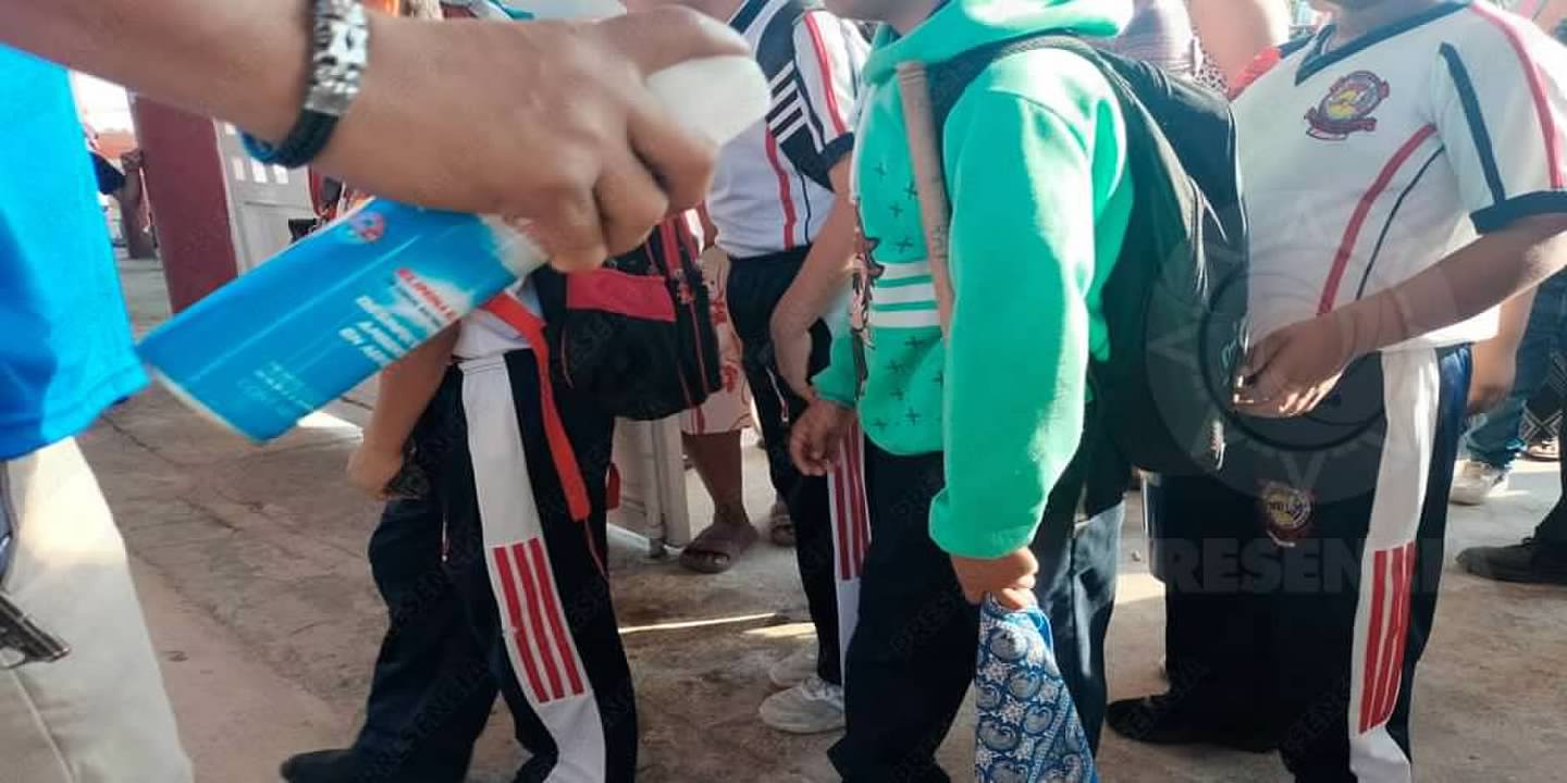 Este jueves, la escuela primaria "Hermanos Flores Magón", ubicada en la calle Jinicuil de la colonia Aviación, implementó la aplicación de gel antibacterial y sanitizante a todos los alumnos al momento de ingresar al plantel, como parte de una acción preventiva ante el aumento de casos en la ciudad.