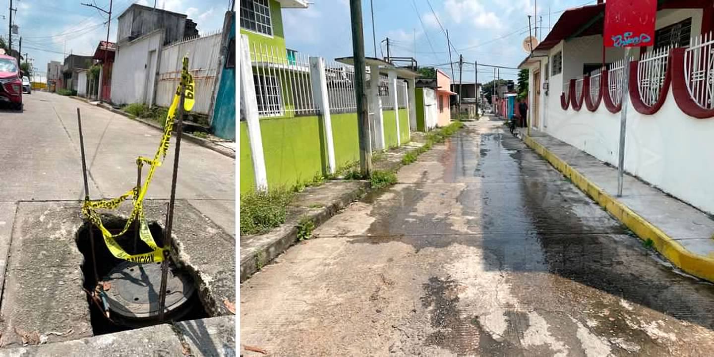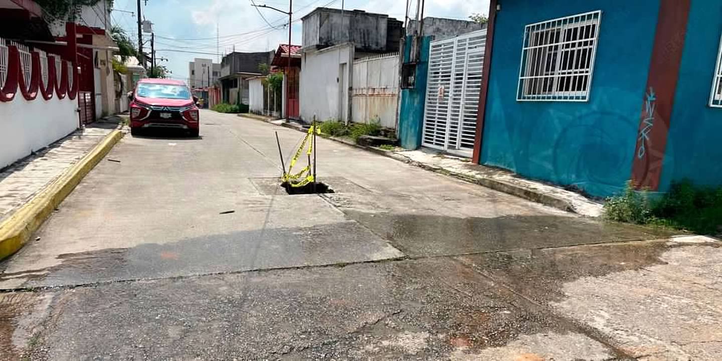 Un socavón se formó en la calle Ogarrio y Agua Dulce, de la colonia Campo Nuevo, atrás de la terminal de autobuses ADO, luego de que colapsara la tapa de un drenaje, generando peligro tanto para peatones como para automovilistas.