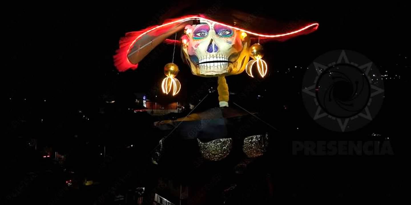 Con una grúa fueron colocadas las estructuras aéreas decoradas con atavíos de la temporada, luces, flores y plumas que en conjunto dan la apariencia curvilínea de esta Catrina.