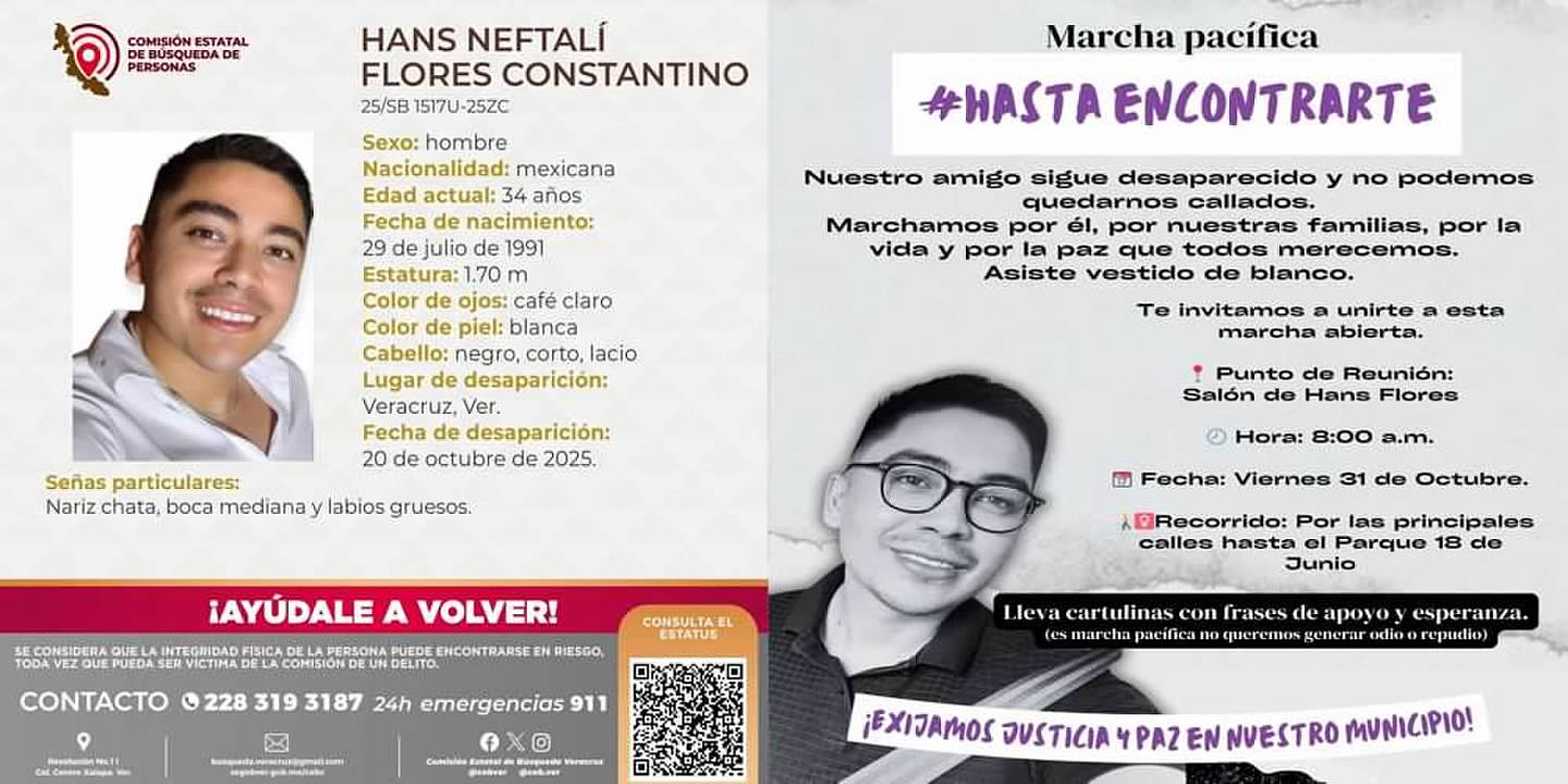 Con una marcha pacífica por las principales calles del municipio de Ángel R. Cabada, familiares, amigos y ciudadanos exigieron la localización de Hans Neftalí Flores Constantino, estilista de 34 años desaparecido desde el pasado 20 de octubre.