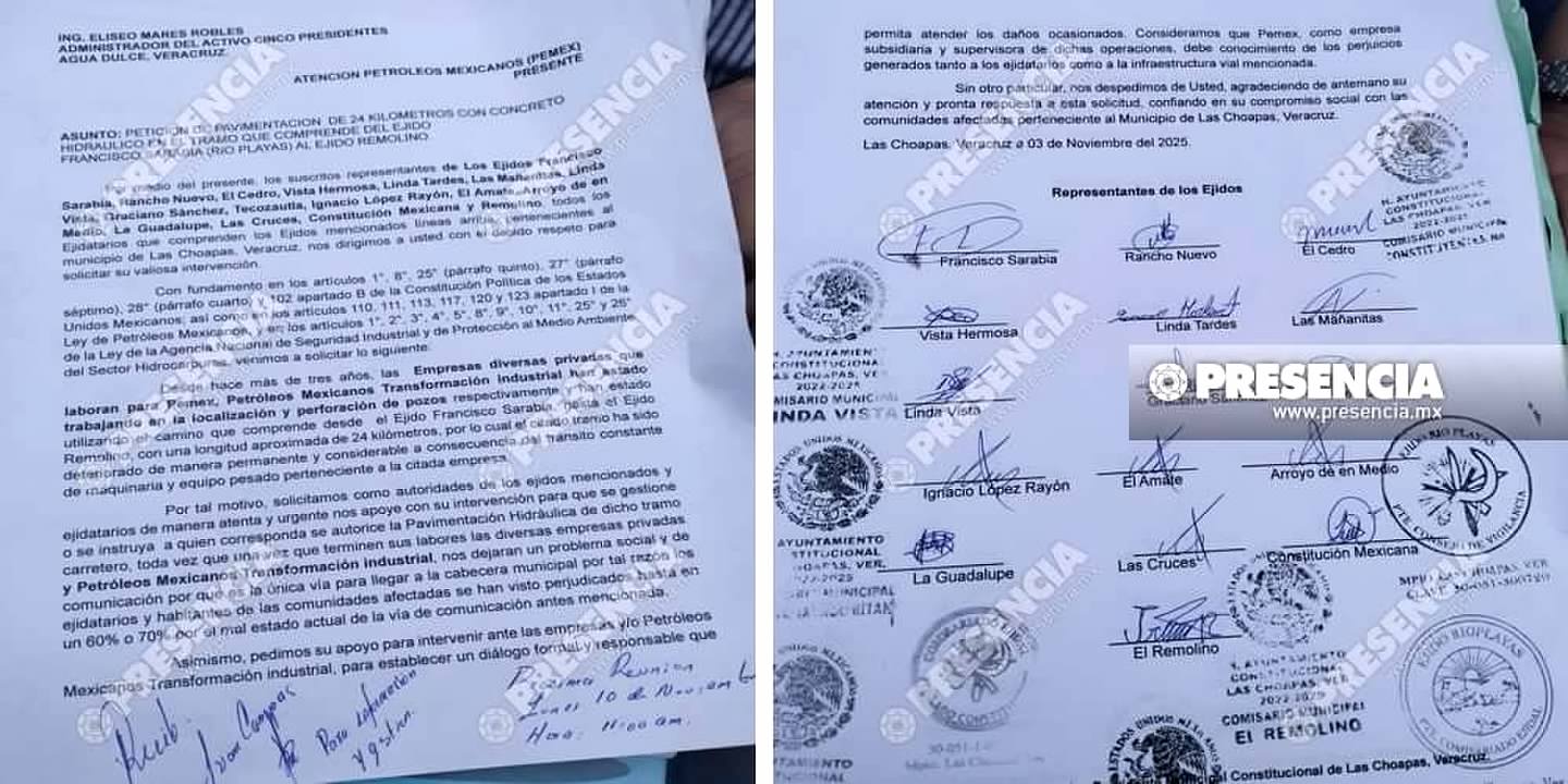 “Consideramos que Pemex, como empresa subsidiaria y supervisora de dichas operaciones, debe tener conocimiento de los perjuicios generados tanto a los ejidatarios como a la infraestructura vial mencionada”, se expone en el documento fechado el 3 de noviembre de 2025.